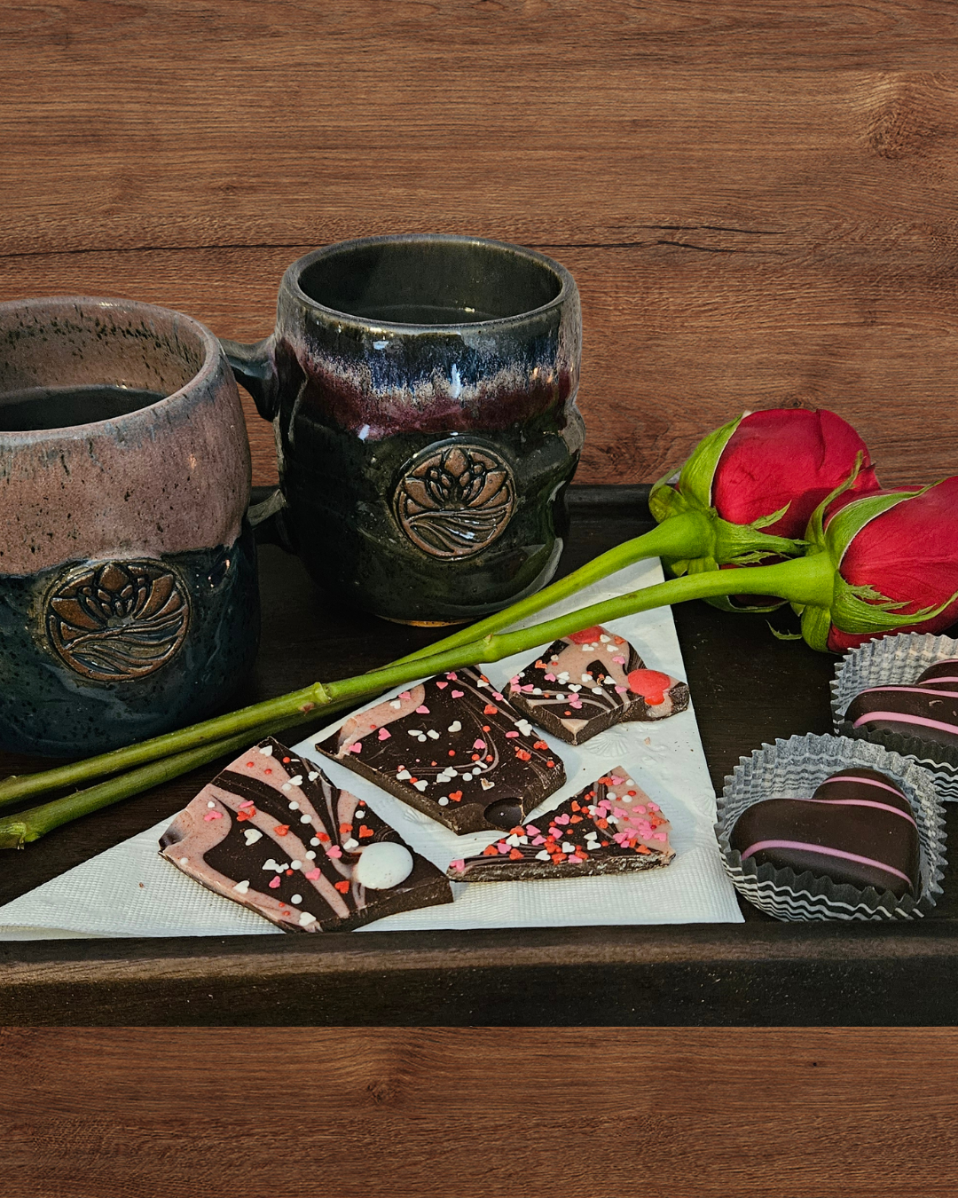 Tray with heart truffles and strawberry cheesecake chocolate bark